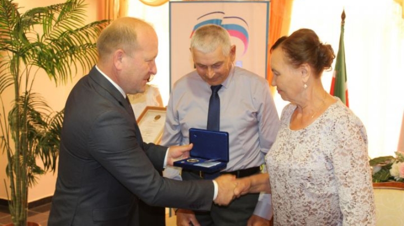 Глава района Марат Гафаров поблагодарил их за труд и за такую замечательную семью, которую они создали. Вручил медаль «За любовь и верность».