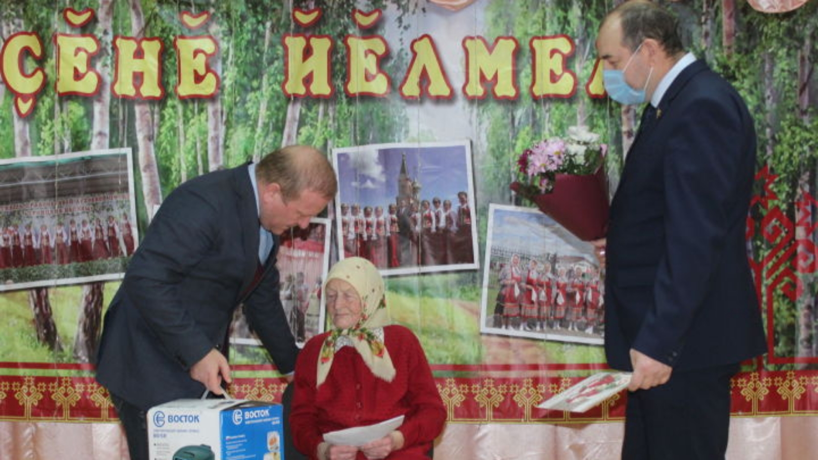 Поздравить юбиляршу со знаменательной датой пришёл Глава района Марат Гафаров. Он вручил Поздравление от имени Президента РФ, подарок и цветы.