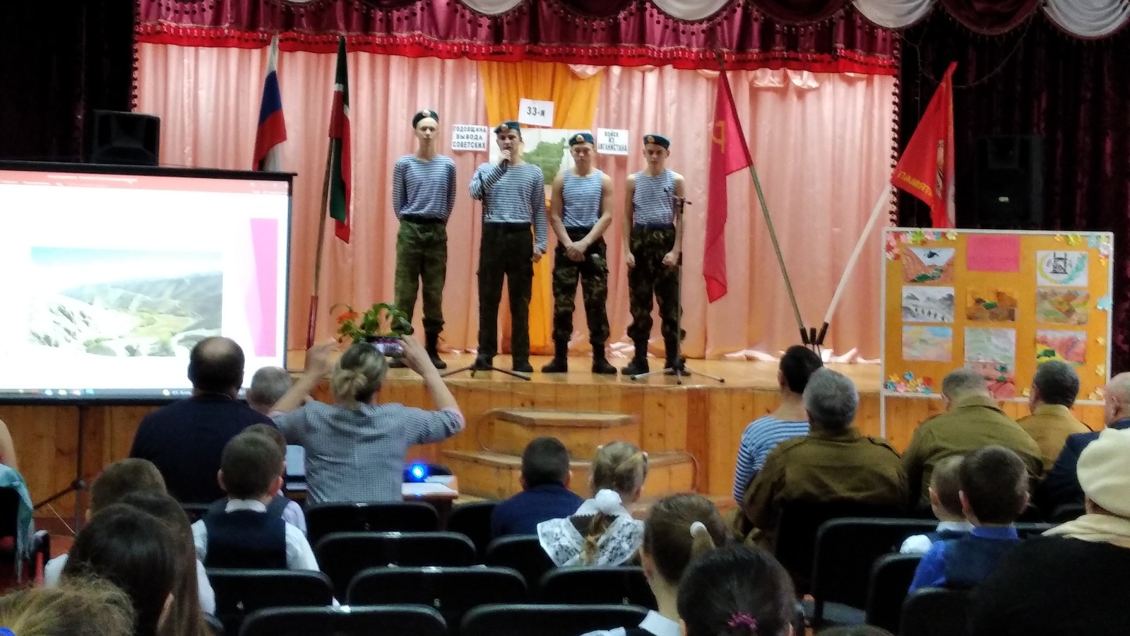 Стихи про афганскую войну читали учащиеся школы Алякин Данил и Николаев Денис, Гафуров Альфис, Макаров Артем, Мискин Максим и Ефимов Александр , они же исполняли песню «Синева».