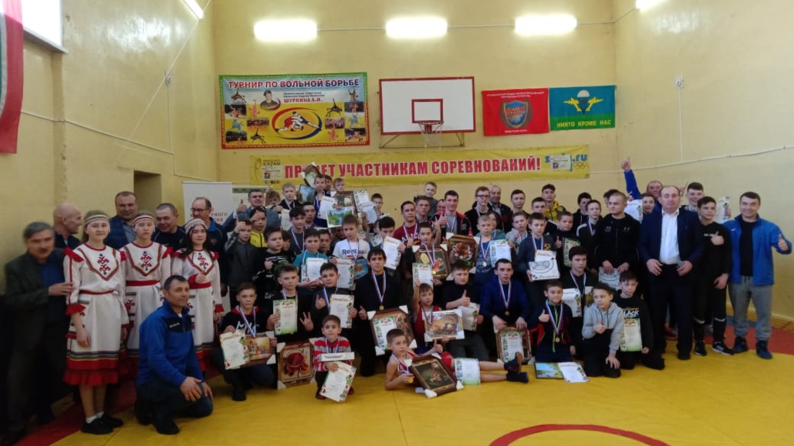 В спортивном зале МБОУ «Новоильмовская средняя общеобразовательная школа» 19 февраля под звуки марша «Вольная борьба», участники турнира заходят в зал и руководитель парадом Петр Рафиков докладывает главе Дрожжановского района Марату Гафарову о готовности спортсменов к турниру.