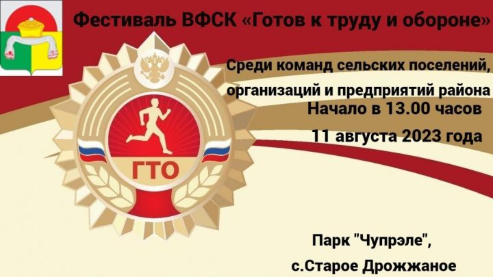 Завтра, 11 августа 2023 года в 13.00 часов, в парке «Чупрэле» состоится фестиваль ВФСК «Готов к труду и обороне» среди команд сельских поселений, организаций и предприятий района. Состав команды 3 участника вне зависимости от пола и возраста. Об этом сообщают организаторы фестиваля.