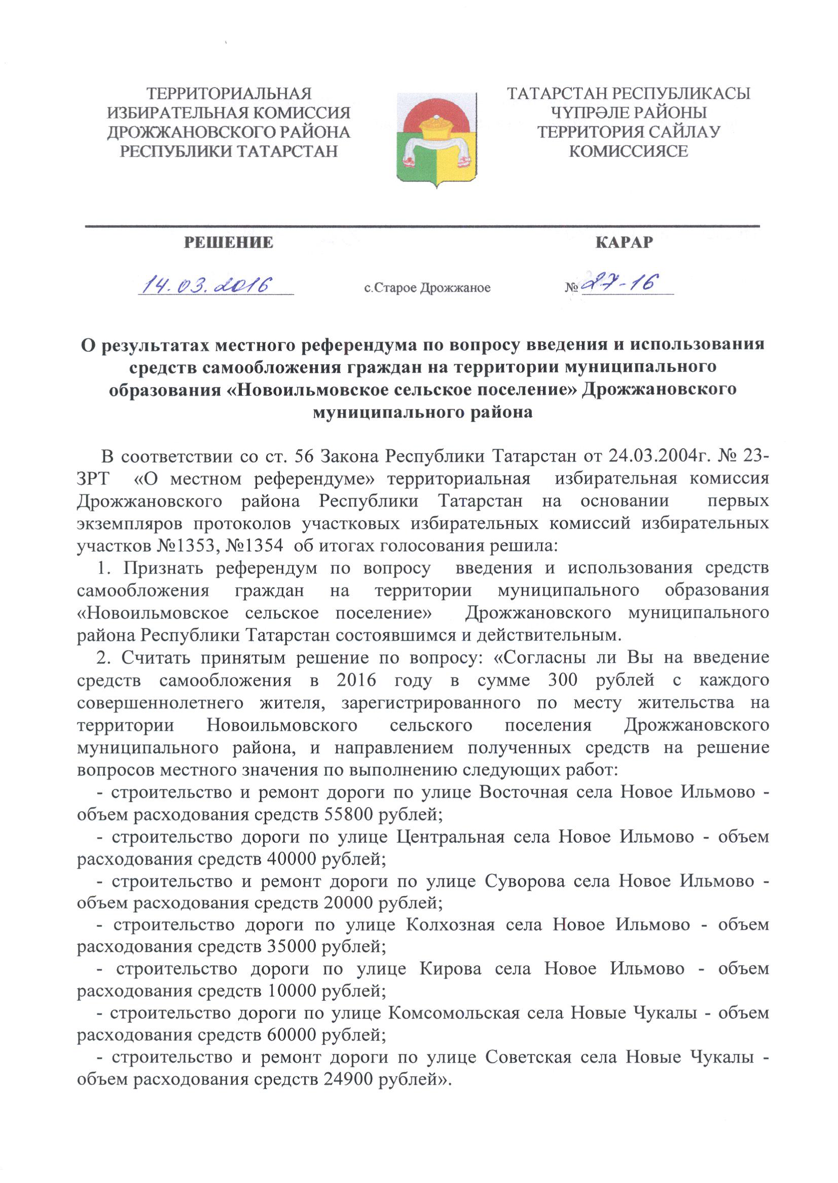 Решение ТИК № 27-16 от 14.03.2016 г. «О результатах местного референдума по вопросу введения и использования средств самообложения граждан на территории муниципального образования «Новоильмовское сельское поселение» Дрожжановского муниципального района