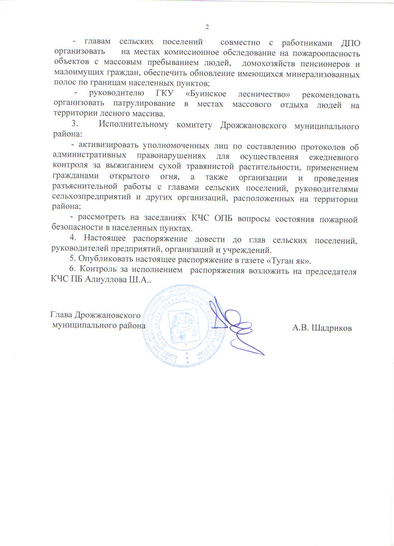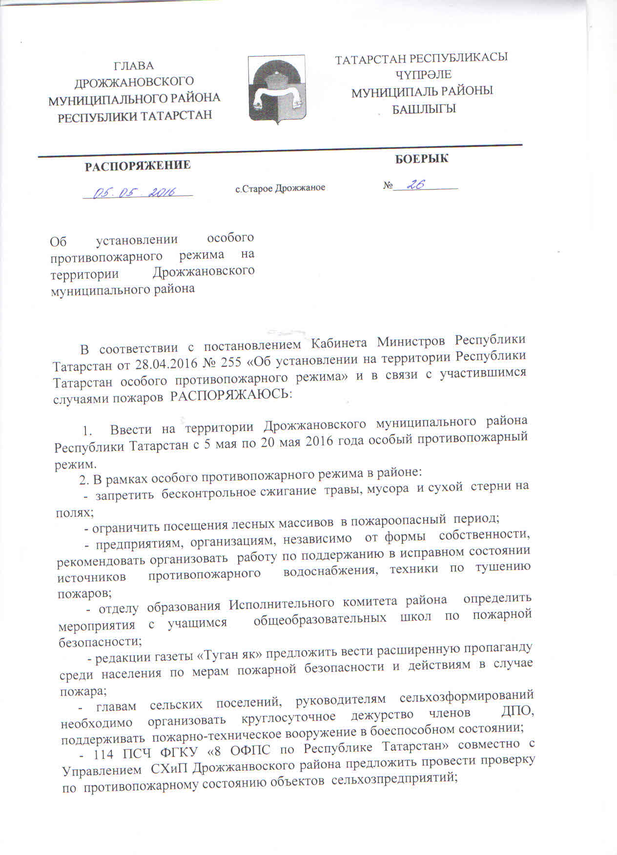 Распоряжение "Об установлении особого противопожарного режима на территории Дрожжановского МР"
